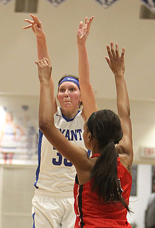 After a swap of free throws, the lead was 46-42 when Tracey Bershers, who had 14 in the game, hit a 3 to push the lead to 7 but a steal and layup by India Atkins had it down to 49-44 with a minute left to play.
