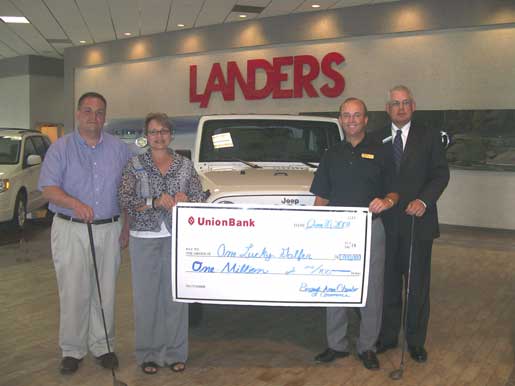Landers Auto Group of Saline County is sponsoring a $1 million hole-in-one shootout as part of the 14th annual Bryant Area Chamber of Commerce Golf Tournament at Hurricane Golf Course on Tuesday, June 30. Above, Rae Ann Fields/Bryant Area Chamber Executive Director, Joe Fisher/Bethel Middle School, Jack Carney/First Security Bank and Rodney Plack/Landers Auto Sales of Saline County display the promotional check that one lucky golfer could win. For tournament registration forms or more information, call the Bryant Area Chamber of Commerce at 847-4702 or see the story elsewhere on this site under the Community index.