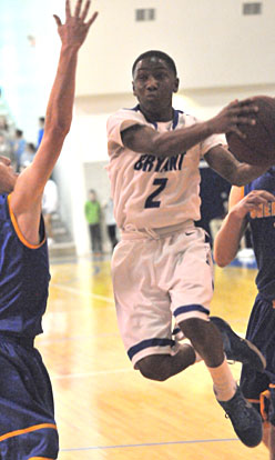 2.15DuckworthKN Desmond Duckworth splits a pair of Sheridan defenders on a drive to the basket. (Photo by Kevin Nagle) ← Previous Next → 2.15DuckworthKN