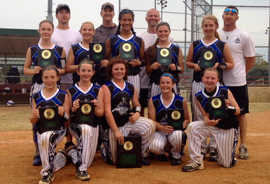 Members of the team include, front from left, Claudia Benning of Prattsville, Gianni Hulett of Bryant, Madison Stokes of Bryant, Payton Freeling of Greenbrier, Rylie Hamilton of Cabot. Back from left, Meagan Chism of Bryant, Hallie Siems of Stuttgart, Jaylen Mallard of Jacksonville, Sophia Hampton of Pottsville, Kayli Pennington of Pottsville. Assistant coaches are, from left, Clay Siems , Clay Hamilton, Richard Weaver with head coach Jack Hulett.