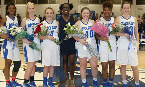 For more photos of this event by Rick Nation, go here; or by Kevin Nagle, go here Bryant Lady Hornets head coach Brad Matthews started seniors Deja Rayford, Lania…