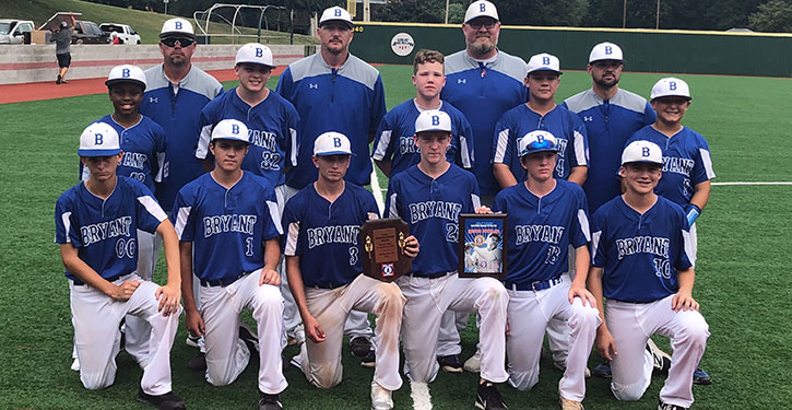 The Bryant team, managed by Jason Greiner with assistance from Jeremy Morrow and Jon Parker, includes Gavin Burton, Tucker Dunn, Caleb Greiner, Drew Hatman, Hunter Holt, Connor Martin, Colby Morrow, Calvin Myles, Kyler Pabon, J.T. Parker and Cade Parker.