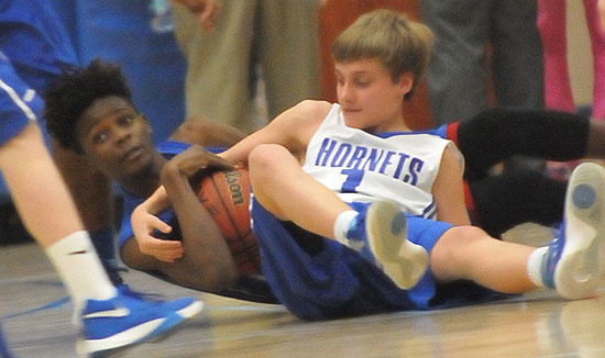 Bryant Blue’s Ben Devine (13) takes a shot over Bryant White”s Kaylon Thurston. (Photo by Kevin Nagle)