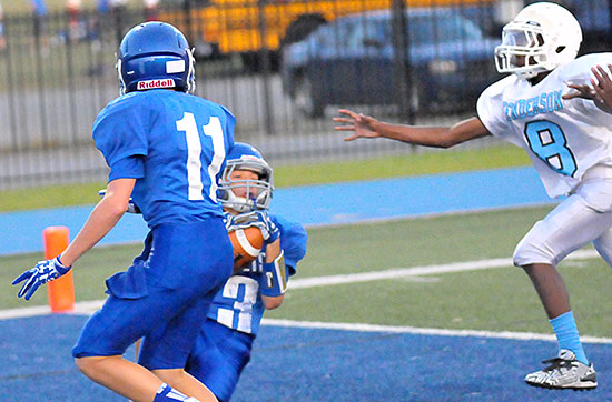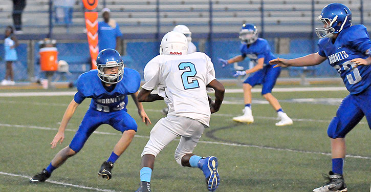 Carson Burnett threw for a touchdown and ran for another while the defense of the Bryant Blue Hornets eighth grade team of Bethel Middle School held off a tough Little Rock Henderson Hawks offense for the shutout in a 20-0 victory on Thursday night at Bryant Stadium.