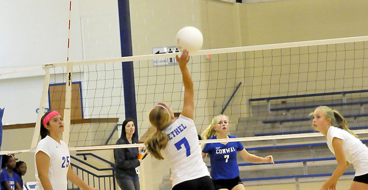 With the Bryant Blue Lady Hornets eighth grade team of Bethel Middle School trailing in the second, 9-13, in the set of their match against the Conway Blue Lady Cats eighth grade, Ashton Inman rotated into service. She promptly served for 11 points in a row as the Lady Hornets rallied for a 2-0 win, 25-22, 25-19 on Monday night at the Bryant Middle School gym.