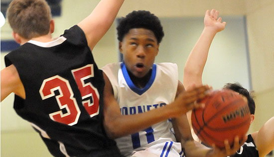 O.J. Newborn (22) splits a pair of Russellville defenders on the way to the hoop. (Photo by Kevin Nagle)