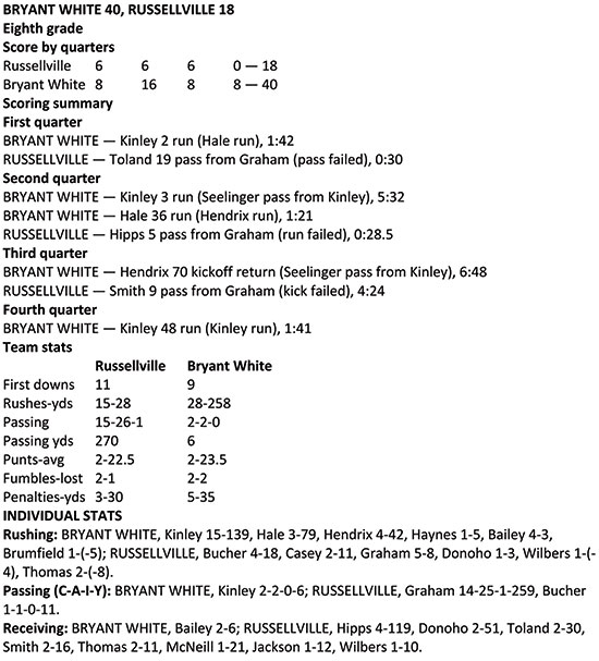 It appeared the Russellville Whirlwinds’ receiver Ty Hipps was going to score. After hauling in a long pass from quarterback Gavin Graham, Hipps was end-zone bound. It looked like the Whirlwinds were about to cut the lead of the Bryant White Hornets eighth grade team of Bryant Middle School from 32-18 to 32-24 or maybe 32-26 late in the third quarter.