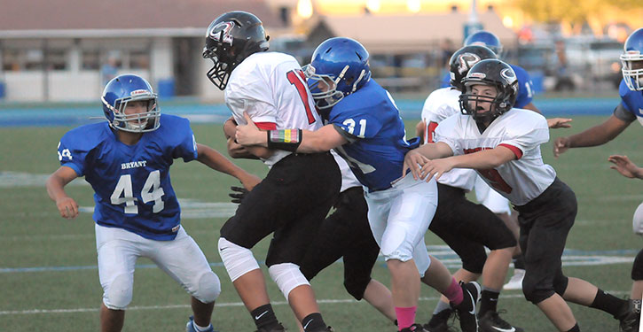It appeared the Russellville Whirlwinds’ receiver Ty Hipps was going to score. After hauling in a long pass from quarterback Gavin Graham, Hipps was end-zone bound. It looked like the Whirlwinds were about to cut the lead of the Bryant White Hornets eighth grade team of Bryant Middle School from 32-18 to 32-24 or maybe 32-26 late in the third quarter.