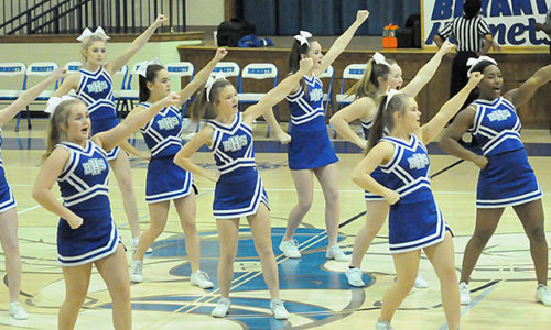 For more photos of this event by Kevin Nagle, go here The Bryant freshman cheer squad performed at halftime of the Hornets’ game against Conway Blue Thursday night…