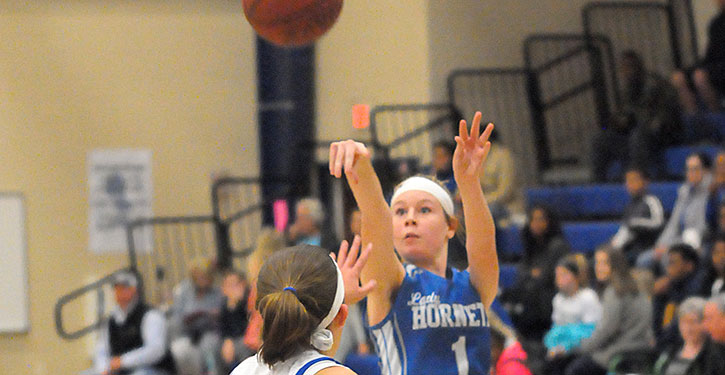 Abby Gentry and Natalie Edmonson converted key free throws down the stretch to help the Bryant Blue Lady Hornets eighth grade team of Bethel Middle School turn a 21-21 game into a 27-22 victory over the rival Bryant White Lady Hornets eighth grade team of Bryant Middle School at the Bethel gym on Thursday.