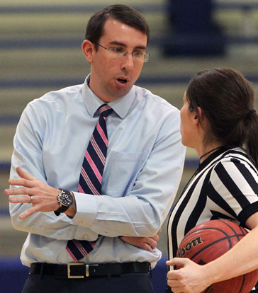 Coach Nathan Castaldi discusses a call with one of the officials during Thursday’s game. (Photo by Rick Nation)