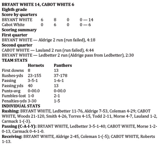 CABOT — Trailing 14-6, the Cabot South Panthers eighth grade team was set to get the ball to start the second half. And, in their patented grind-it-out style, they marched inexorably from their own 29 to the Bryant White Hornets’ 24.