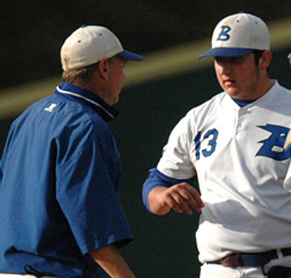 Bryant head coach Kirk Bock talks to pitcher Zack Jackson during the fourth inning. (Photo by Kevin Nagle)