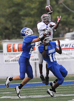 Pine Bluff Robey’s Joshua Steward leaps for a reception over Bryant’s Tristan Calhoun and James Polite. (Photo by Kevin Nagle)