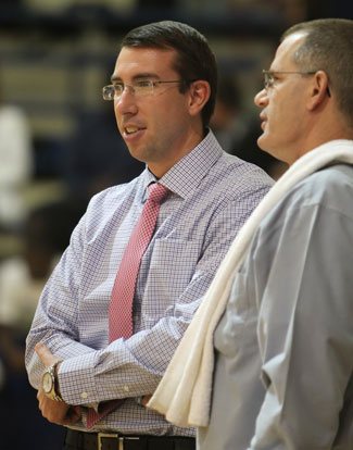 Bryant freshman head coach Nathan Castaldi, left, visits with assistant Lawrence Jefferson during Thursday’s game. (Photo by Rick Nation)