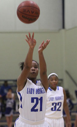 Destiny Martin (21) launches a free throw as teammate Deja Rayford (32) looks on. (Photo by Rick Nation)