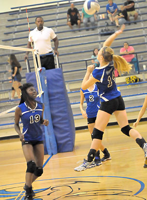 Meagan Chism led the Lady Hornets with three kills and five service aces. She had 15 attacks with just one error and was good on nine of her 12 serves.