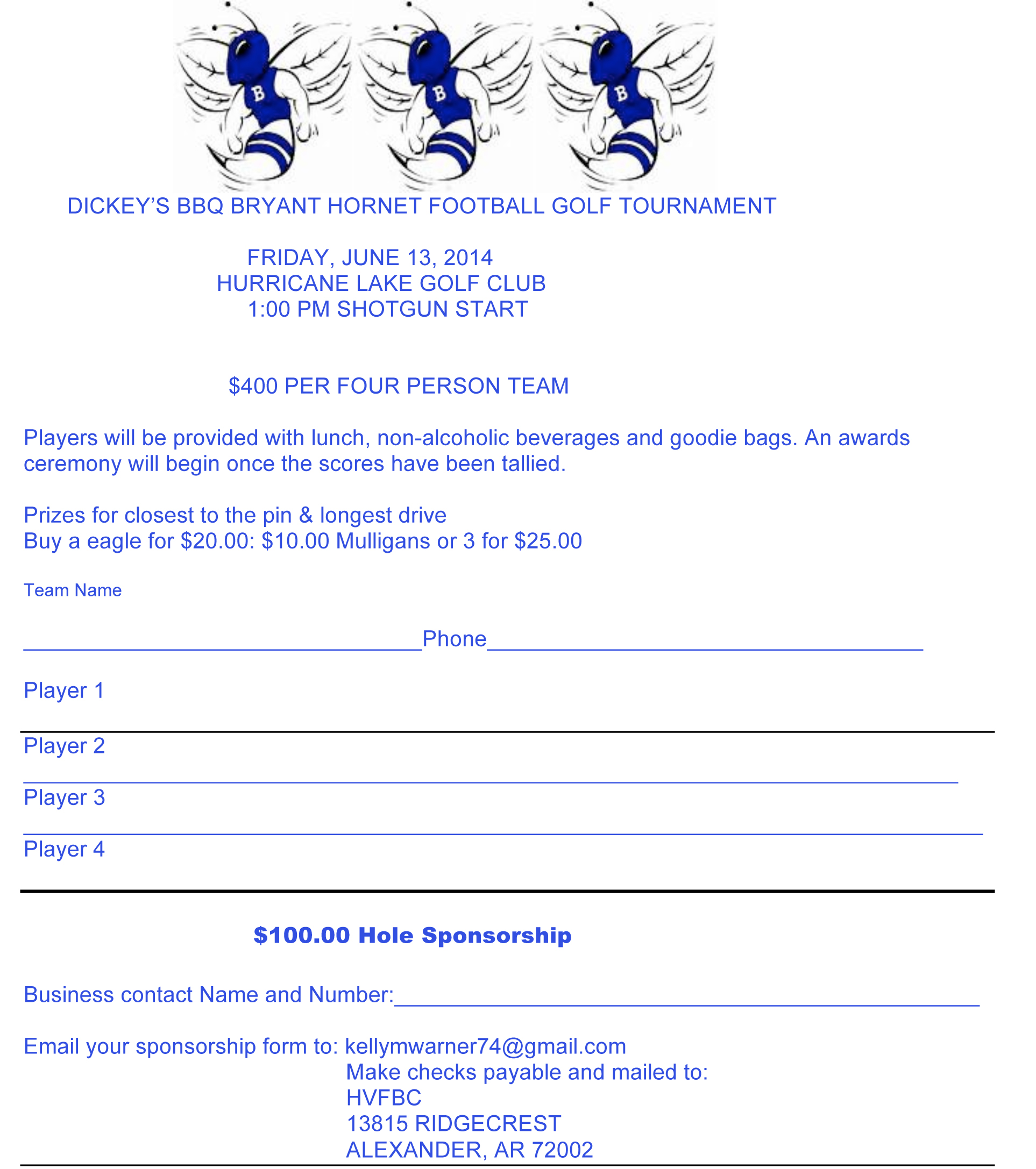 The fourth annual four-person scramble golf tournament to benefit the Bryant Hornets football program will be held this Friday, July 13, at Hurricane Golf Club. The shotgun start will be at 1 p.m.