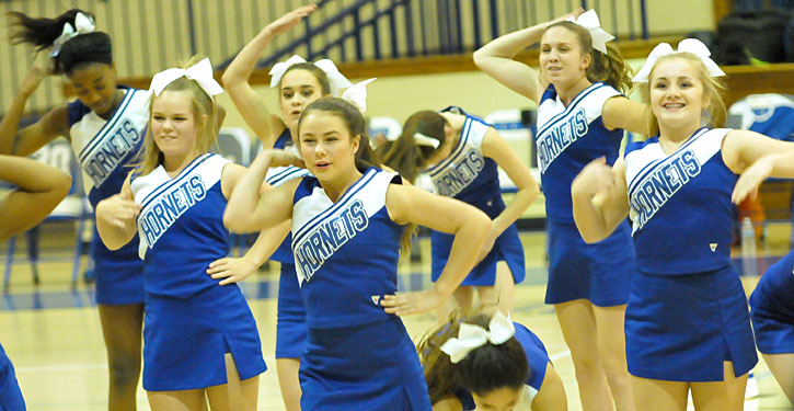 The Bryant freshman cheerleading team performed at halftime of the Hornets’ game against the Russellville Whirlwinds at the Bryant Middle School gym on Monday night.