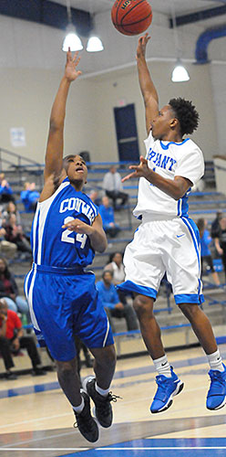 Braden Godwin tries to get a jumper over the defensive presence of Conway Blue’s Jayden Williams. (Photo by Kevin Nagle)