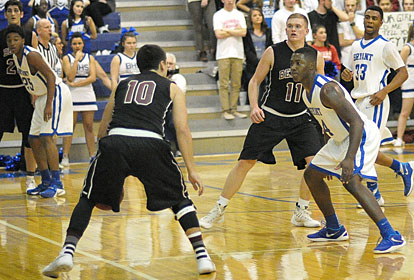 Marvin Moody (24), Braylon Steen (25) and Romen Martin apply defense as Benton’s Cason Maertens (10) looks for an opening. (Photo by Kevin Nagle)