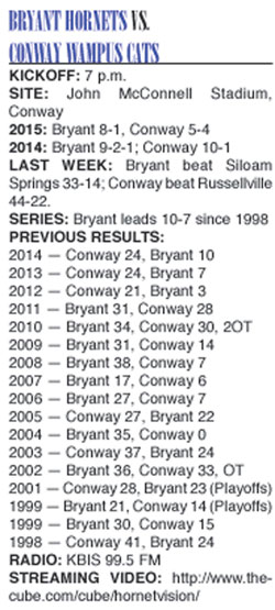 Fast forward to this season and, again, the Hornets have been splendid if not dominant every week. They have just one blemish on their record, a loss to unbeaten Greenwood four weeks ago. And they’re 8-1 despite major injuries to key players. Though Conway’s not 9-0 this time — the Wampus Cats are 5-4 — the Hornets have to avoid any letdown. After all, Conway’s beaten Bryant in each of the last three seasons and of their four losses this season, three have been against teams (Cabot, Springdale Har-Ber, Greenwood) that are among the best in the state with a combined record of 26-1. (The other loss was to a 6-3 Alma team.)