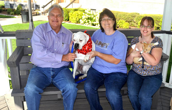 Saline County Circuit Clerk Dennis Milligan presented a check for $1‚000 to Ann Sanders of[more] the Saline County Humane Society. During his campaign, Milligan promised to donate part of his personal salary to charitable causes in the county. Shown above are (from left to right) Milligan, Charlie the dog, Sanders and Deputy Circuit Clerk Jennifer L. Davis of Bryant holding a cat named “Shotgun Dan” because he survived being shot with a shotgun.
