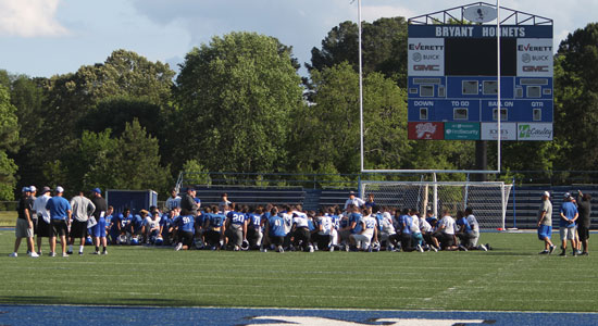 Bryant head coach Buck James talks to his team after a recent spring workout. (Photo by Rick Nation)