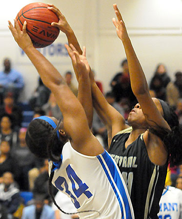 But it wasn’t until things looked most desperate for Bryant that the Lady Hornets revved it up into a frantic comeback. Led by junior point guard Tierra Trotter, the Lady Hornets whittled a 17-point deficit midway through the third quarter down to 2 points in the final minute. And they gave themselves a chance to pull even in the end. Three times in the last 20 seconds, they had a shot at tying the game. But a contested layup came off the rim, two free throws refused to fall and, with :02.2 to go, a bad inbounds pass left them behind in excruciating fashion, 47-45.