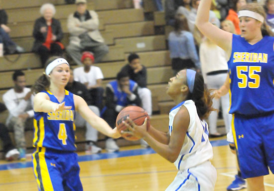 Bryant’s Jayla Anderson gets crunched between a pair of Sheridan players under the basket. (PHoto by Kevin Nagle)