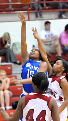 There was a lot of contact in Tuesday’s game as Bryant’s Jayla Anderson (15) can attest. (PHoto by Kevin Nagle)
