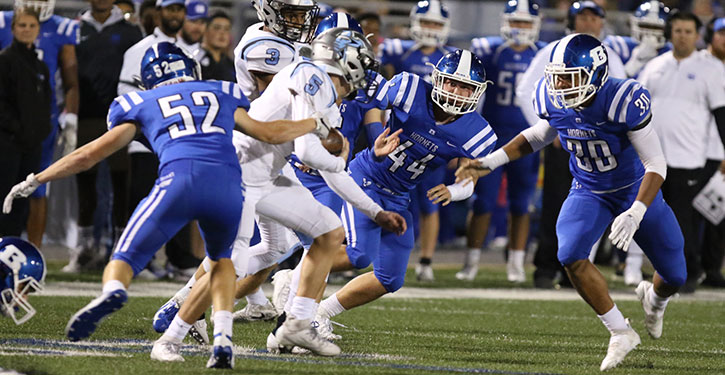 Those strikes contributed to a 41-0 halftime lead for the Hornets over the Fort Smith Southside Mavericks. Bryant improved to 7-0 on the season with their seventh mercy-rule victory and fifth game in which the mercy rule was in effect at halftime. With the running clock in the second half, head coach Buck James and his staff worked in a whole lot of players on the way to a 55-0 victory.