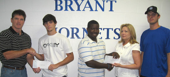 Sawyer Nichols and DeSean Prichett received the first Logan Parker Memorial scholarships[more] given in honor of the late star quarterback for the Bryant Hornets. The scholarships were presented today by Logan Parker's family, parents Jim Mack and Robin Parker and brother Lance Parker, the new offensive coordinator for the Hornets football team. The family plans to make the presentation every year to Bryant High School seniors who exemplify the school spirit, enthusiasm and involvement of their son who was tragically killed in an incident in Little Rock on Feb. 18, 2012, at the age of 21.