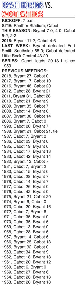 Temperatures in the low 50’s, an 80 percent chance of rain — the conditions figure to be completely different than they’ve been for the last six weeks when the top-ranked Bryant Hornets are challenged tonight by the Cabot Panthers in a 7A-Central Conference game.