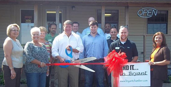 The Bryant Chamber of Commerce Ambassadors join Jerry Gibson in the grand opening of the new location[more] of Bryant Motors on Highway 5 North in front of Collegeville Schools. Those on hand included, from left, Rae Ann Fields, Karen Grice, Jerry Gibson (owner) and son, Chase, Brandon Cumba, Barbara Riggin. In the back are Allison Ramsey, Nick Patel, Andy Garcia, Tim Blakely and employees Ronnie Ross and Carlos Garcia.
