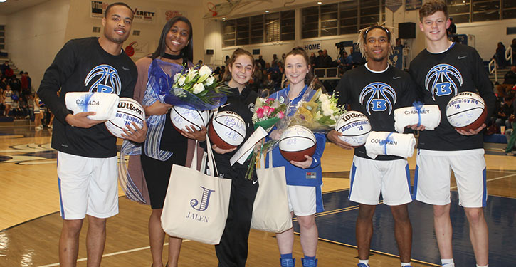 On the occasion of their final home game, the Bryant High School senior basketball players were honored on Friday night at the Hornets’ Nest. From left, Deron Canada, Jalen Sparks, Kelly Williams, Paige Adams, Allen Coleman, and Sam Chumley.