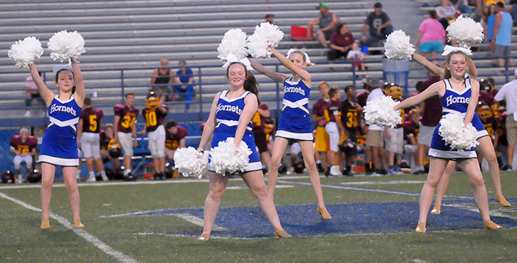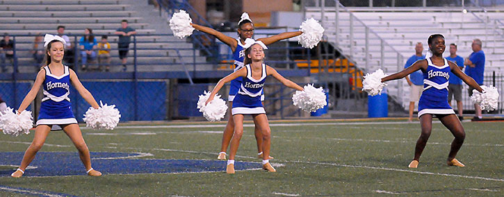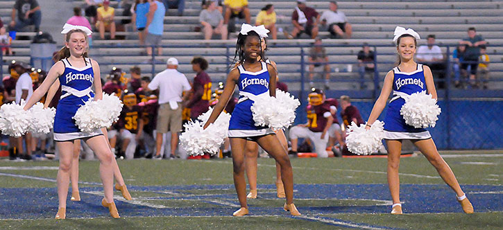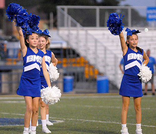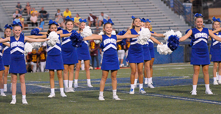 The Bethel Middle School seventh-grade cheer and dance squads entertained during a break in the action between the Bryant Blue Hornets and the Lake Hamilton Wolves at Bryant Stadium Monday night.