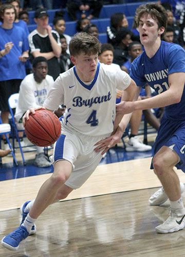 After trailing by 13 points late in the first half to a hot-shooting Conway Wampus Cats team, the Bryant Hornets, once again, showed the heart that has them headed to the Class 7A State Tournament. They came all the way back and, on a pair of free throws by senior Sam Chumley with 4:47 left to play, took a 47-46 lead.