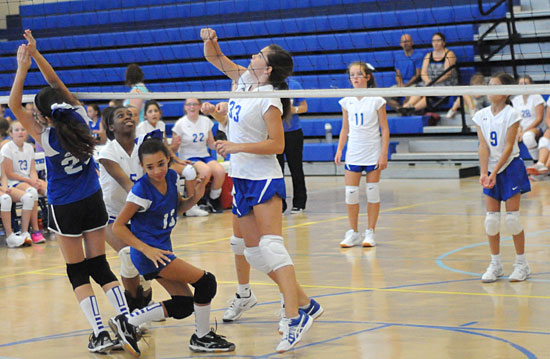 In a seventh-grade volleyball jamboree at Bethel Middle School, the Bryant White Lady Hornets of Bryant Middle School won a pair of A team matches and a B team match as well.