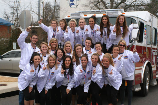 The Bryant High School Cheer squad was welcomed back to town by a police and fire department escort after it captured the National High School Cheer championship in Orlando, Fla., over the weekend.